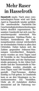 Nach einer Pause aufgrund des Corona-Virus und des dadurch notwendigen Einsatzes der Ordnungspolizeibeamten erfolgten ab dem 21.04.2020 wieder Geschwindigkeitsmessungen in Hasselroth. Wir blitzen einmal wöchentlich im wechselnden Modus in allen drei Ortsteilen von Hasselroth. Festzustellen ist hierbei, dass sich die Zahlen der festgestellten Überschreitungen stark verschlechtert haben. Beispielhaft seien hier folgende Messergebnisse erwähnt: In Neuenhaßlau ergaben sich in der Bahnhofstraße und in der Barbarossastraße an 2 Messtagen ca. 50 Verstöße. In Niedermittlau wurden an 2 Messtagen in der Alte Dorfstr. und in der Taunusstraße rund 100 Verstöße festgestellt, wovon 5 Personen zukünftig zu Fuß gehen dürften. In Gondsroth kam es an 3 Messtagen zu 532 Verstößen, wovon mehr als 20 Fahrzeugführer demnächst auch auf ihr Auto verzichten dürfen.